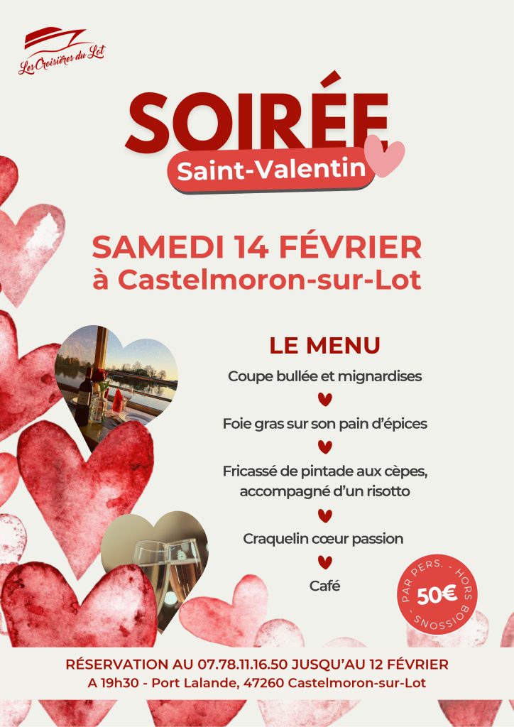 À l’occasion de la Saint-Valentin, Les Croisières du Lot organisent une soirée spéciale le samedi 14 février à Castelmoron-sur-Lot, idéale pour partager un moment romantique en couple.