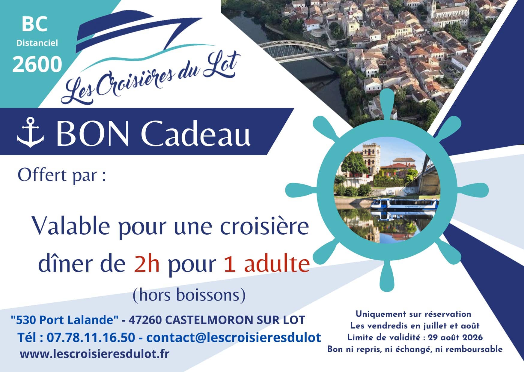 Bon Cadeau Offrez-vous une promenade fluviale sur le Lot « Une idée cadeau ? Offrez un moment de détente et de bonheur à vos proches, amis… à bord du Lou Vent d’Olt !» Bon pour une croisière d’un soir avec repas (durée 2h), les vendredis de juillet à août en savoir plus Bon pour une croisière déjeuner (durée 3h), les mardis et jeudis de juin à septembre en savoir plus Bon pour une croisière déjeuner (durée 4h), les dimanches de mai à septembre en savoir plus